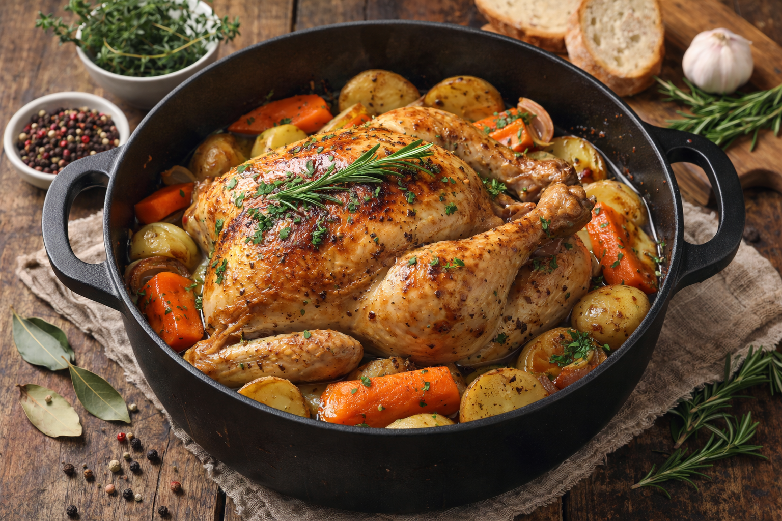 Choix du poulet : Un poulet fermier entier ou des cuisses de poulet offrent infiniment plus de goût qu\’un poulet standard. Si tu prends un poulet entier, assure-toi qu\’il rentre confortablement dans ta cocotte – les meilleures cocottes en fonte sont d\’au moins 5 litres.