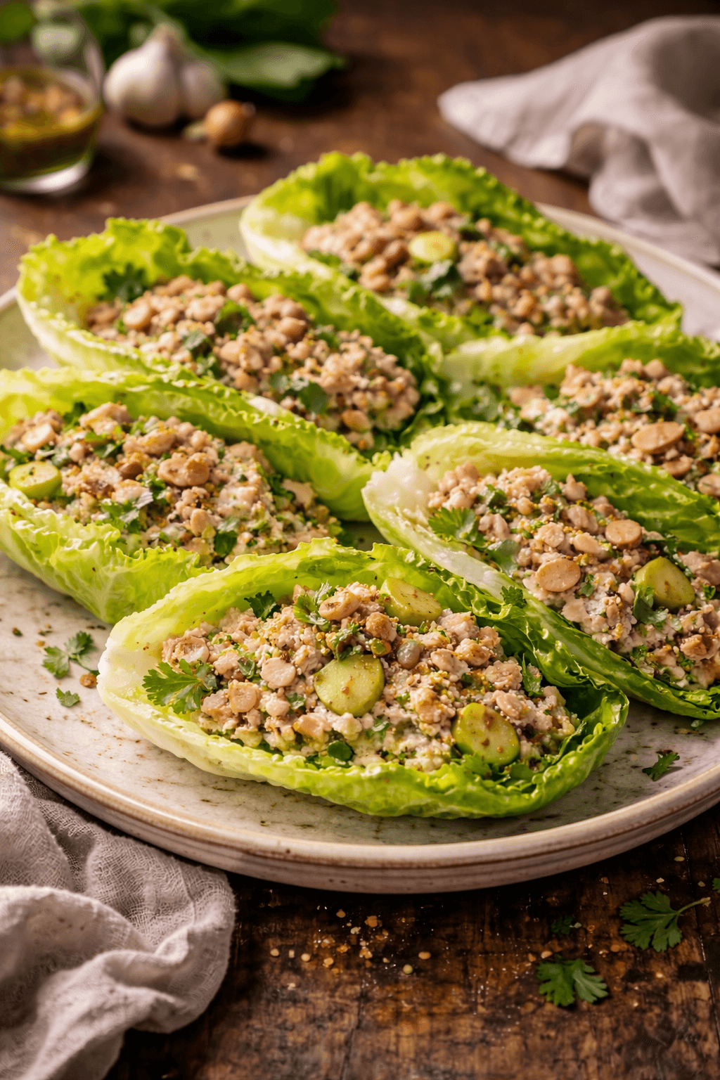 Dépose une belle cuillère de garniture au centre de chaque feuille de laitue. Ajoute, si tu le souhaites, quelques dés d’avocat ou des pois chiches pour plus de texture. Replie délicatement la feuille pour former un wrap.